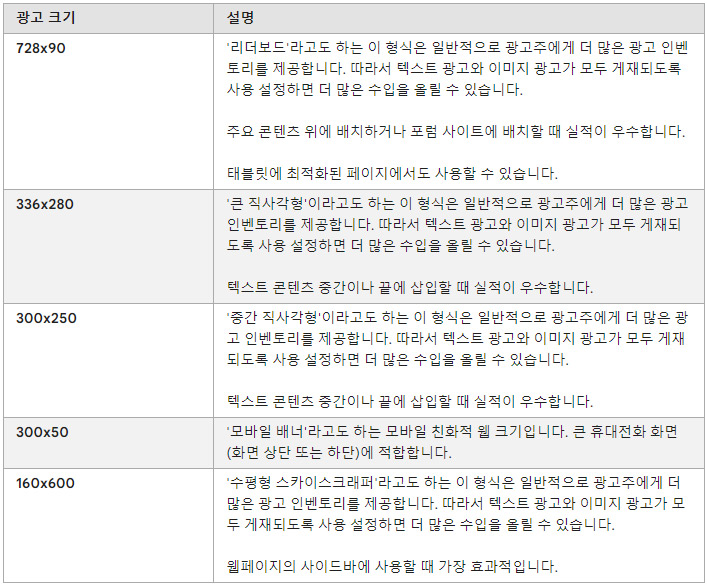 다양한 싸이즈가 있는데 구글은 수익성과 효율이 좋은 구분을 해두었다.